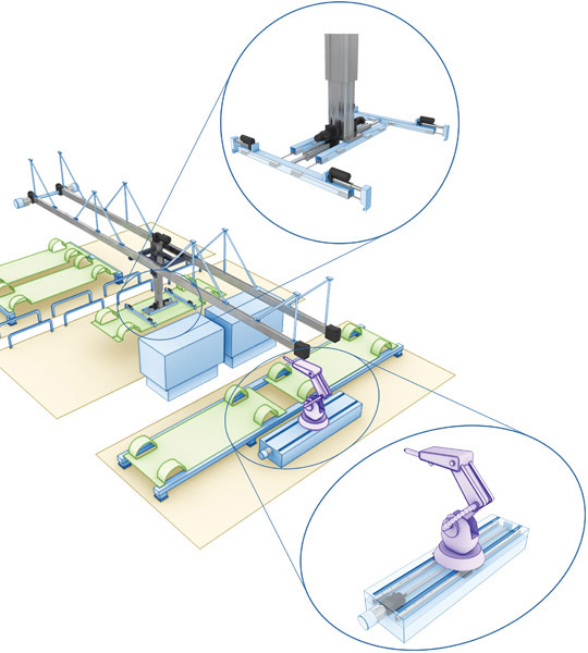 物料搬運解決方案有時起到將無法相鄰布置的生產(chǎn)單元串連起來的作用。在這些單元之間移動貨物、零配件,意味著就要用速度來彌補距離,但不能妨礙其他流程。高架運輸就是一種解決這個問題的方案,這樣貨物就不會占用人行道或叉車道,從而為其他生產(chǎn)設(shè)備騰出寶貴的地面空間。