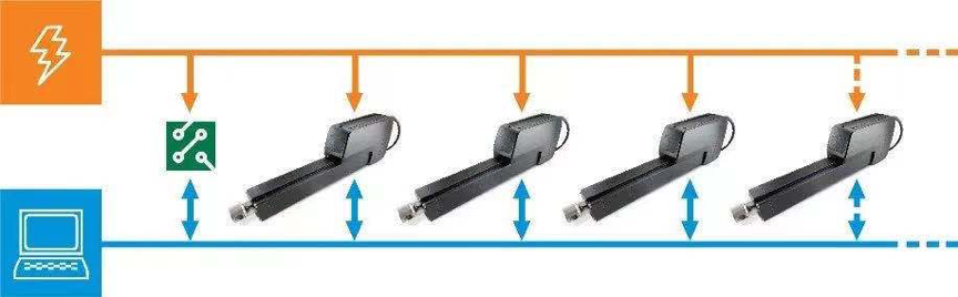 電動推桿內部內集成了電子器件,包括限位開關、位置反饋、同步功能以及總線